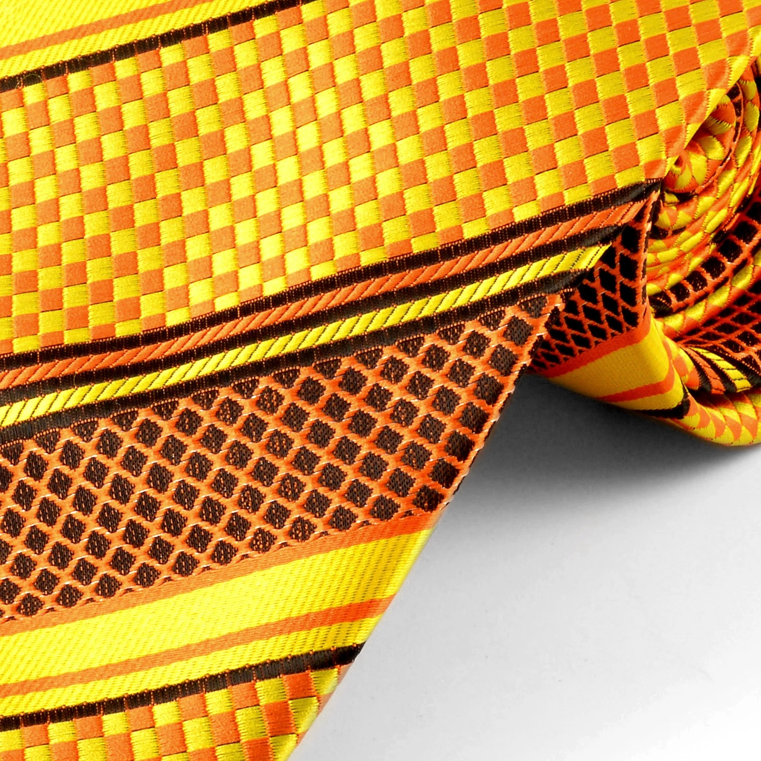 Colorée et rétro, que demander de plus à une cravate? Cette cravate à rayures jaune et orange avec de jolis détails noirs arbore un look vintage trÚs original.