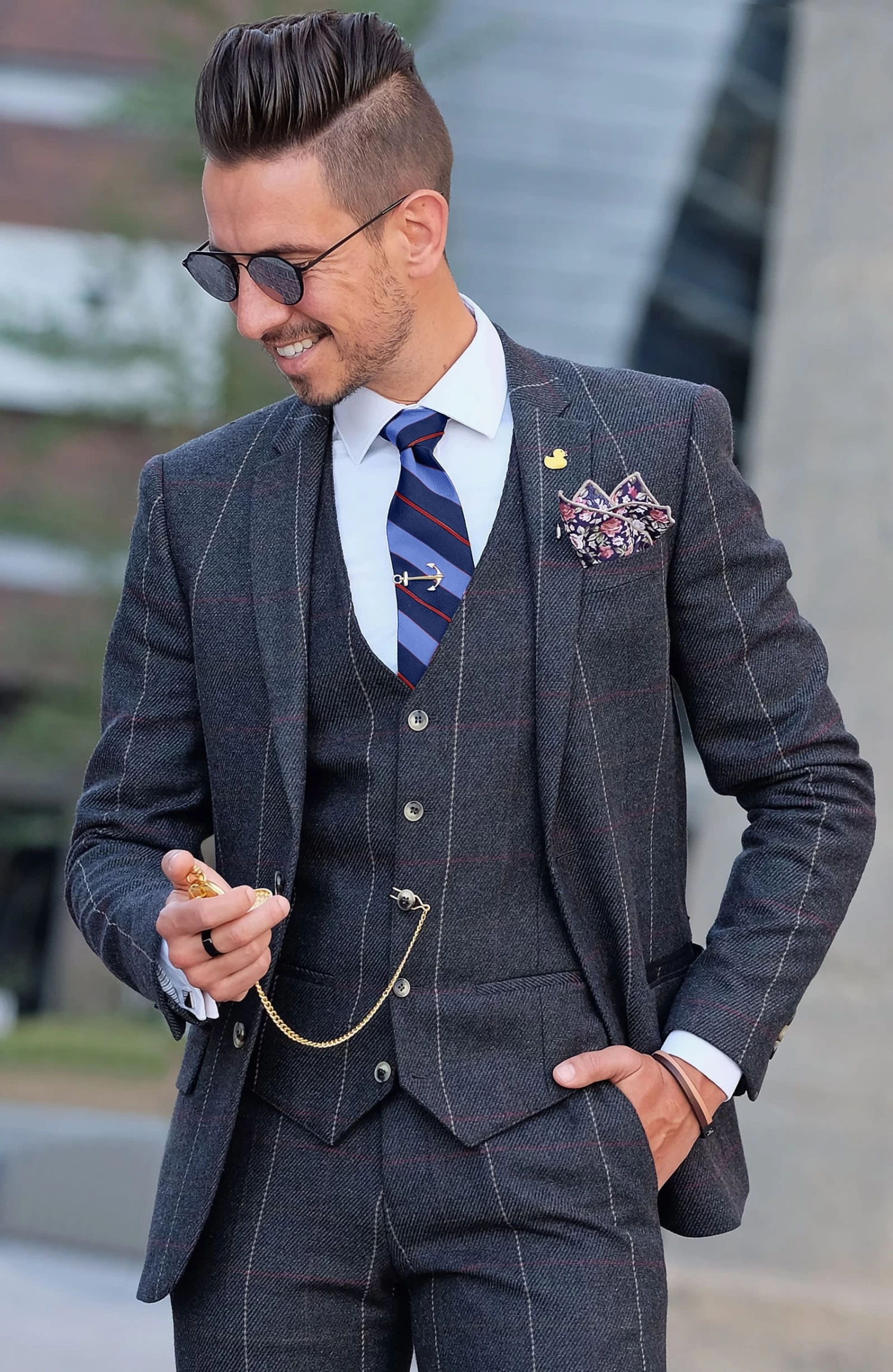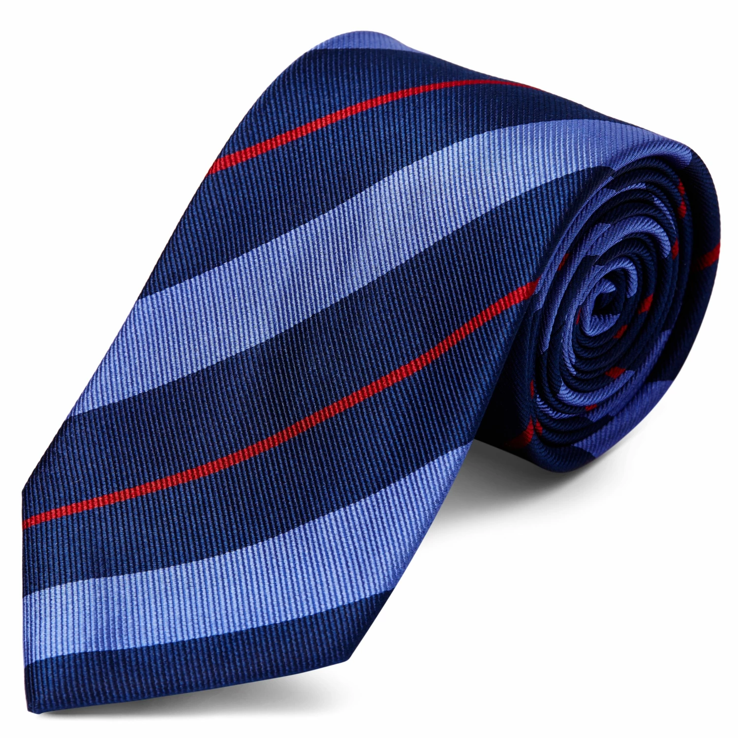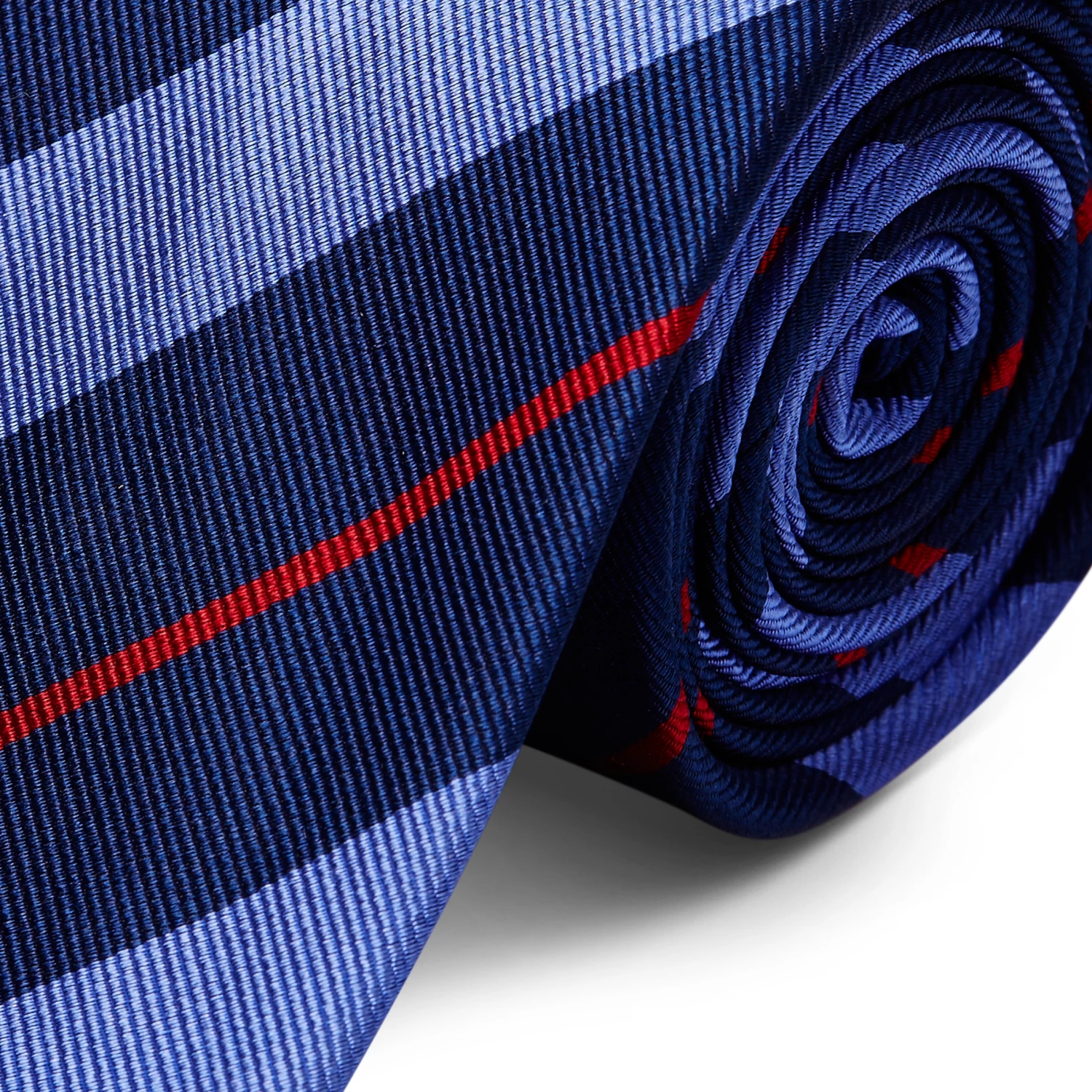 Des rayures bleu marine et bleu pastel rehaussées d’une touche de rouge écarlate donnent à cette cravate à rayures un look particulièrement dynamique.