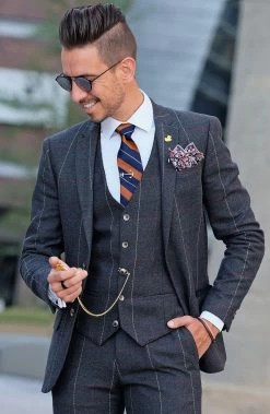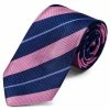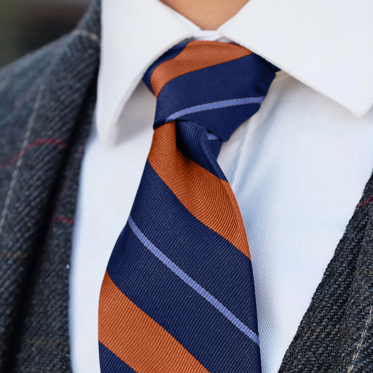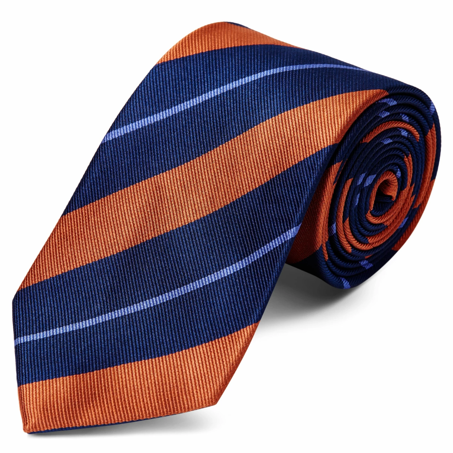 Cette cravate arbore de larges rayures orange vif et bleu marine contrastées de bleu pastel qui donneront une touche distinguée à votre look sur mesure.