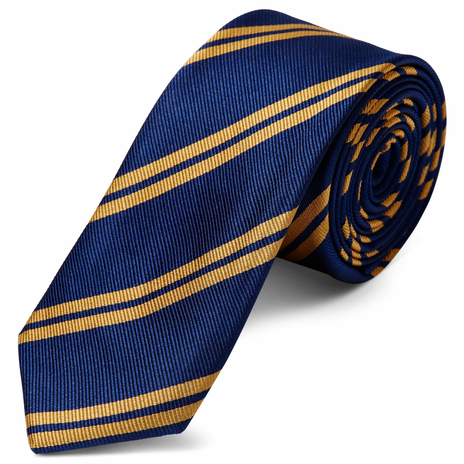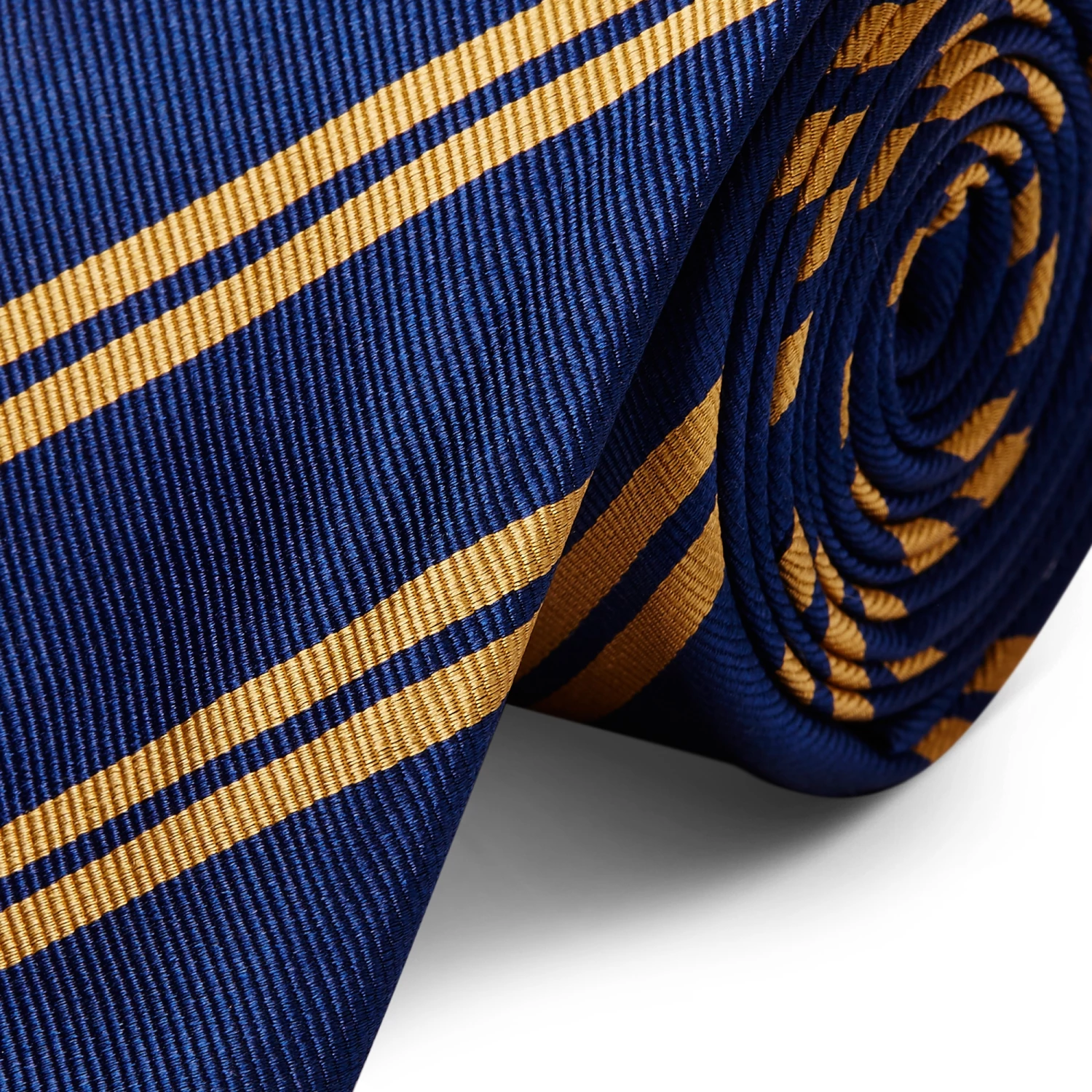 Avec ses rayures dorées parallèles sur sa trame de fond bleu marine, cette cravate étroite en soie douce et légère ajoutera une touche élégante et luxueuse à votre encolure.
