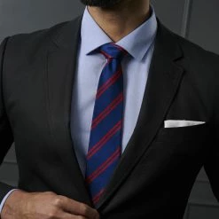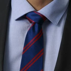 De vibrantes rayures rouges écarlates contrastent avec le fond bleu marin de cette cravate pour lui procurer un look classique et élégant.