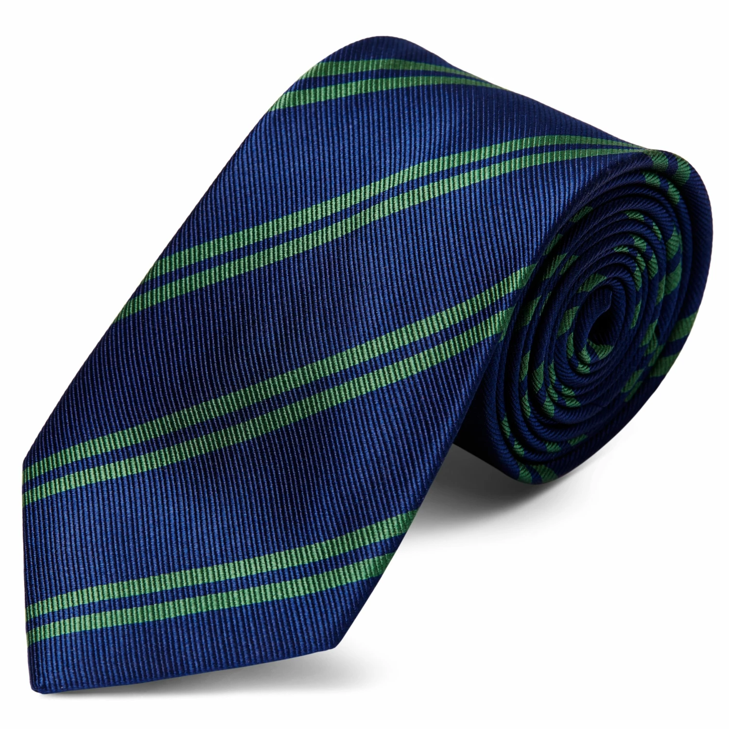 Des fines rayures vertes parallĂšles contrastent subtilement avec le fond bleu marine de cette cravate, lui procurant un look moderne relativement sobre.