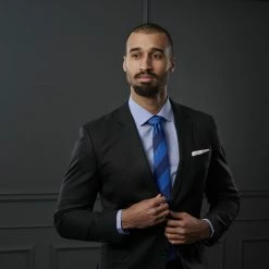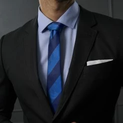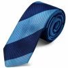 Cette cravate slim est décorée de larges rayures audacieuses dans des tons bleus subtilement contrastés.