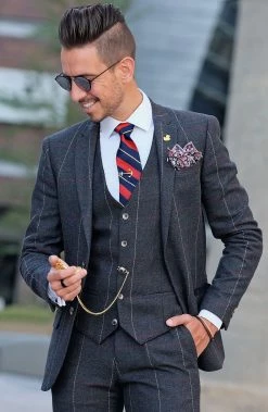 Une cravate à la trame bleu marine décorée de larges rayures rouge écarlate et de fines rayures dorées en alternance. Un accessoire au look unique de façon classique.