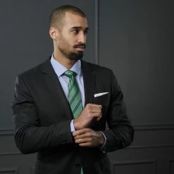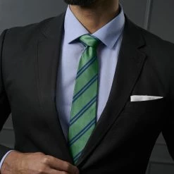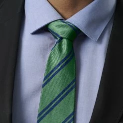 Simple et élégante, cette cravate verte est dotée de rayures bleu marine (assemblées par paires) qui agrémenteront votre encolure de maniÚre charmante.