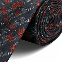 Voici une cravate que vous pouvez porter tout l’hiver… même après l’arrivée et le départ du Père Noël. Conçue dans un gris foncé, cette cravate légère en polyester présente un paysage urbain hivernal avec des chutes de neige et de minuscules arbres blancs.