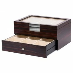 Un joli coffret en bois à deux étages parfait pour protéger et ranger vos cravates préférées. Fabriqué en panneaux de fibres à densité moyenne dans une finition ébène magnifiquement contrastée par des raccords en métal argenté et un intérieur couleur crème.